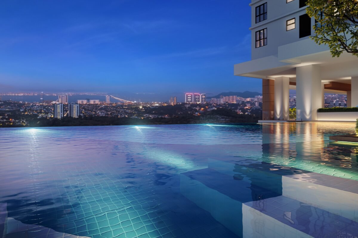 360° 全景视野:从高层阳台望出去,你可以看到城市天际线、远处的 Penang Bridge、连绵的山脉以及泳池和绿色景观。早晨喝咖啡,傍晚看落日,这种感觉很难在市区其他新公寓找到。